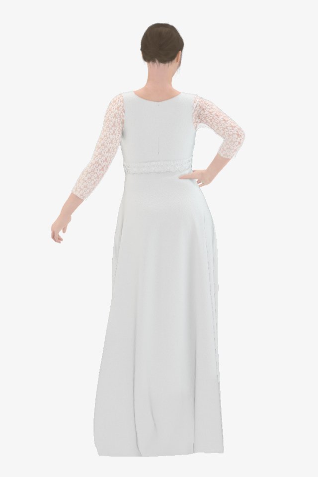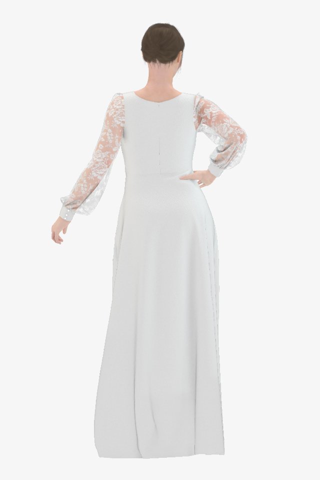 modestie en dentelle / dos v transparent en dentelle /manches papillons en mousseline / ceinture en galon moyen / jupe froncée en mousseline / fermeture boutons tissu