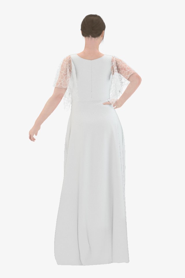col carré en crêpe / dos couvert en crêpe / manches papillons en tulle brodé / jupe évasée en crêpe / fente au milieu / fermeture zip